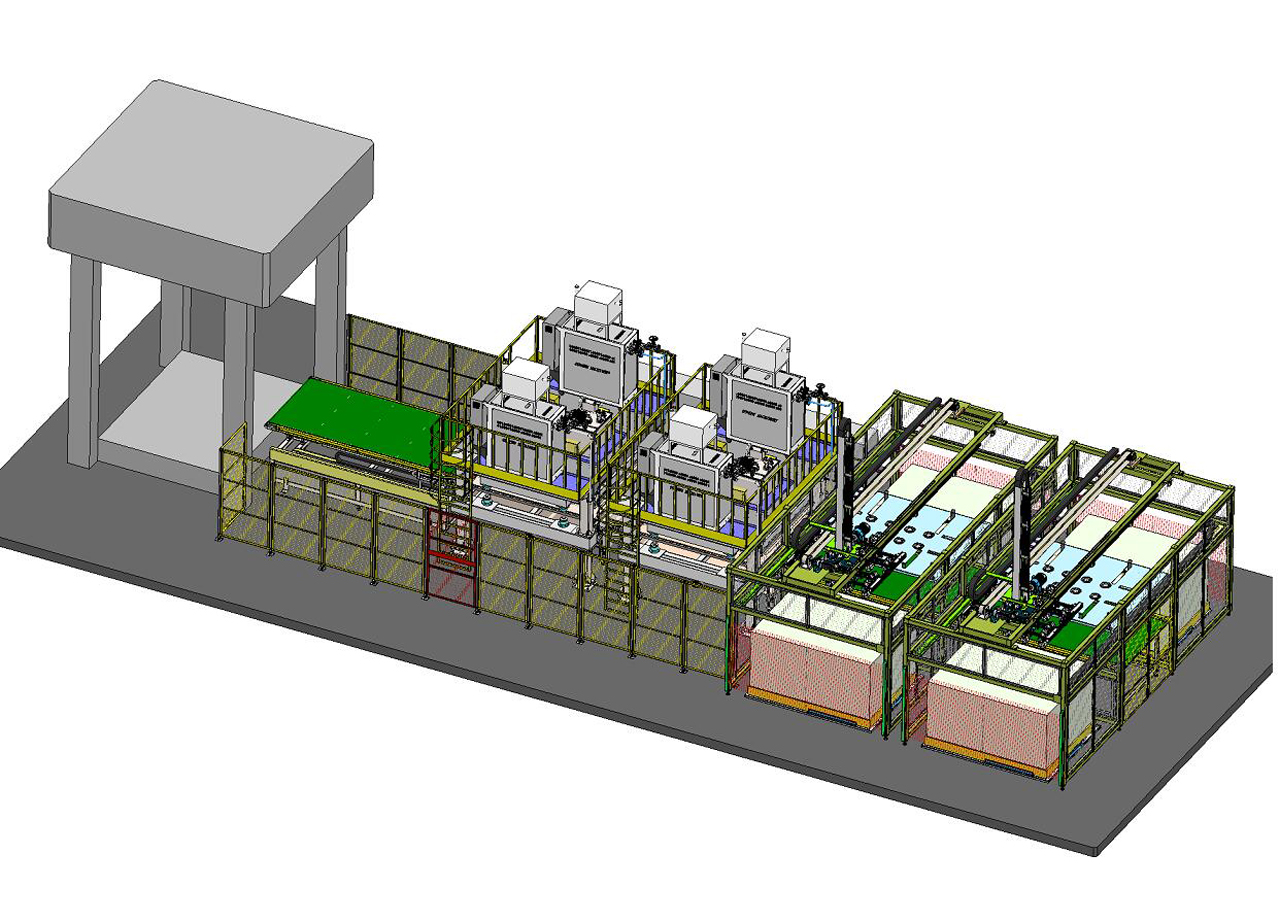 The car carpet heating and forming production line consists of a feeding platform (feeding section), an oil temperature machine heating (heating section), a forming press (forming section), an automatic unloading device (lower part section), a conveying and clamping system, and other auxiliary devices.